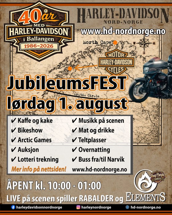 I 2026 feirer vi 40 år med Harley-Davidson i Ballangen og inviterer MC-entusiaster til Jubileumsfest lørdag 1. august 2026 i Ballangen.